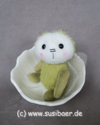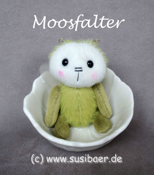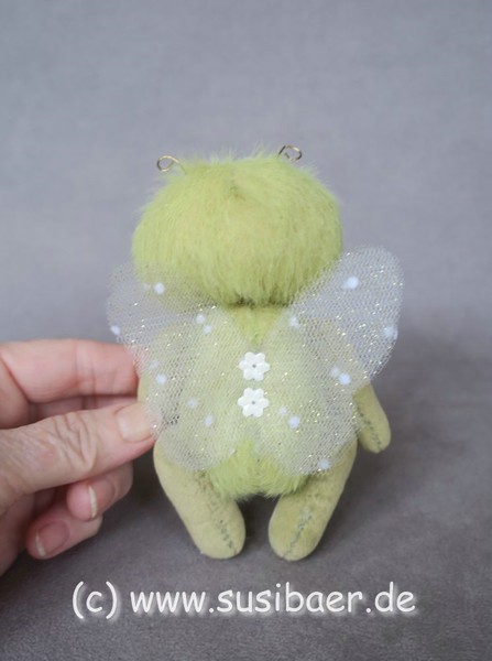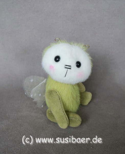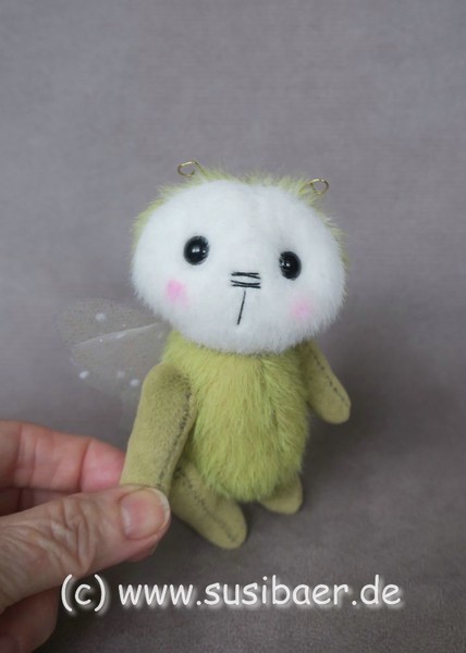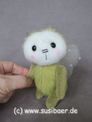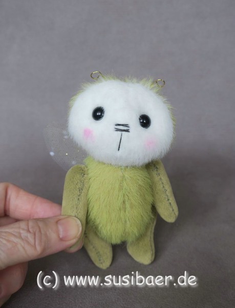 ist ohne Fühler ca 12cm und groß Genäht habe ich ihn aus verschiedenen Minibärenstoffen und Tüll, er hat 5 Gelenke und Glasaugen aus Lauscha