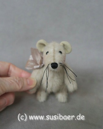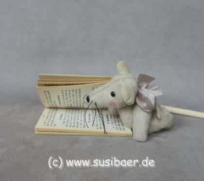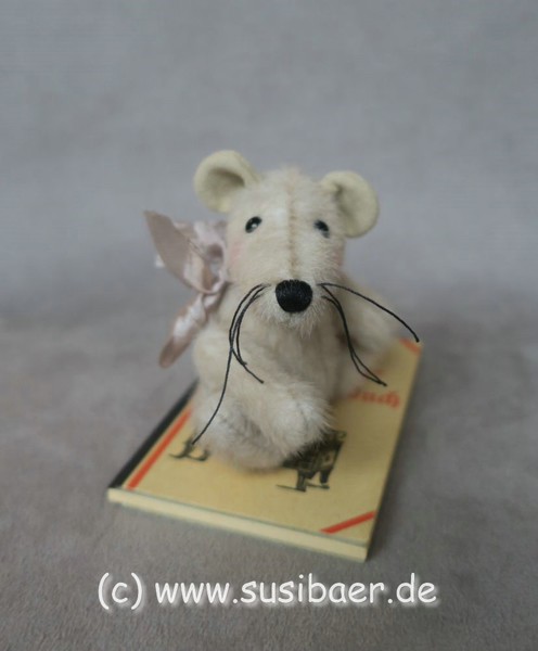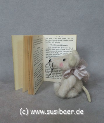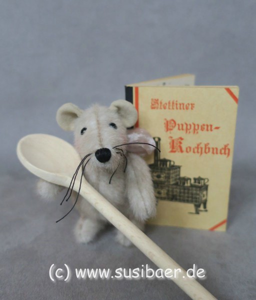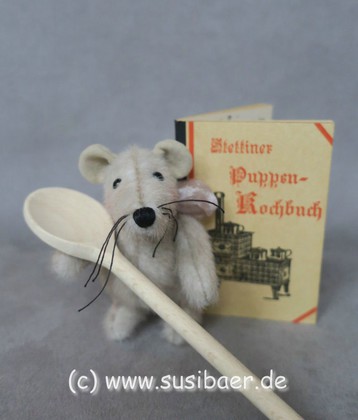 Er ist ca. 9,5cm groß, aus Longpile genäht, hat Glasaugen aus Lauscha und ist voll beweglich. Er hat ein kleines, altes Kochbuch und einen Rührlöffel dabei