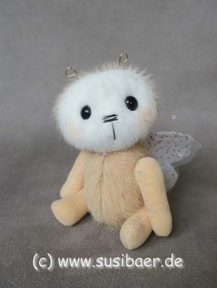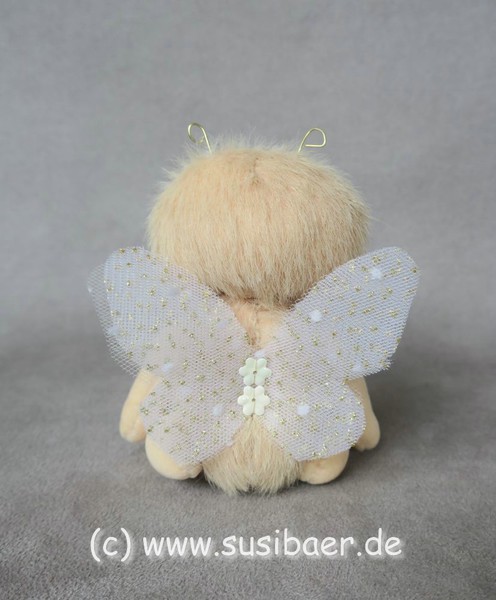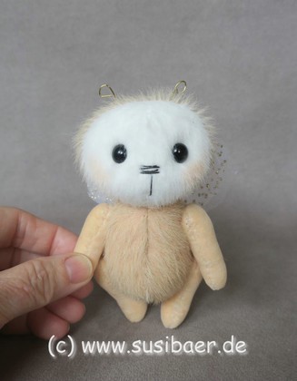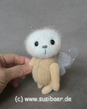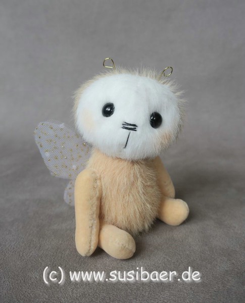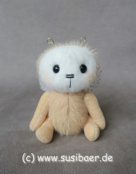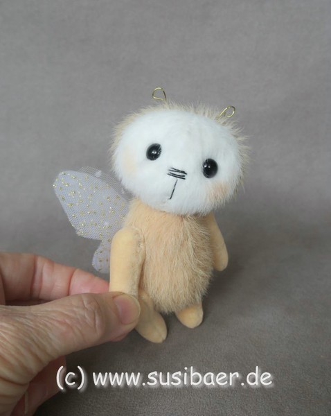 ist ohne Fühler ca 12cm und groß Genäht habe ich ihn aus verschiedenen Minibärenstoffen und Tüll, er hat 5 Gelenke und Glasaugen aus Lauscha