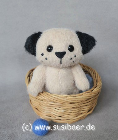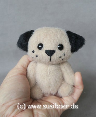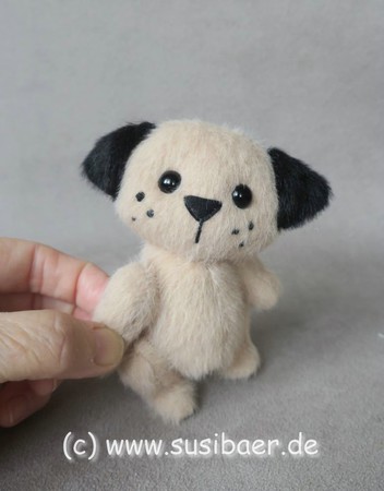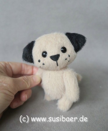 Genäht habe ich ihn aus Minibärenstoffen, er hat 5 Gelenke und Glasaugen aus Lauscha