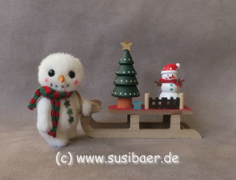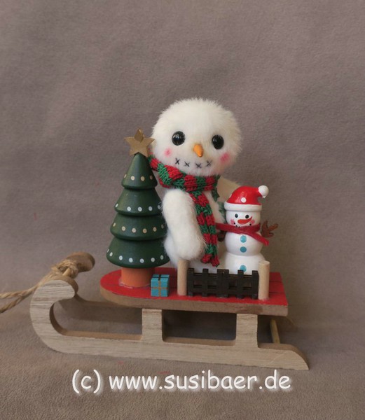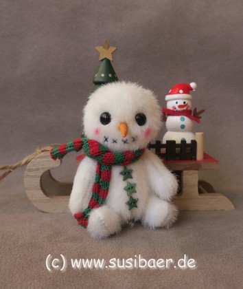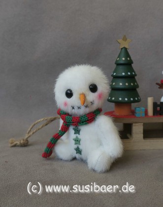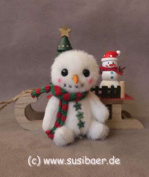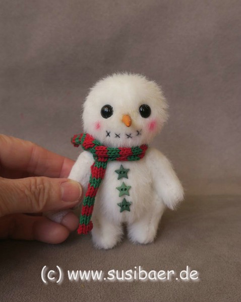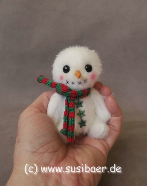 ist ca. 10cm groß, hat 5 Gelenke, Glasaugen aus Lauscha, eine modellierte Nase und ist aus Longpile genäht