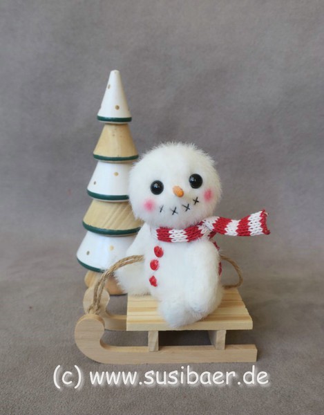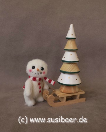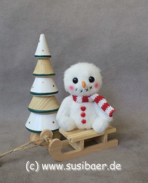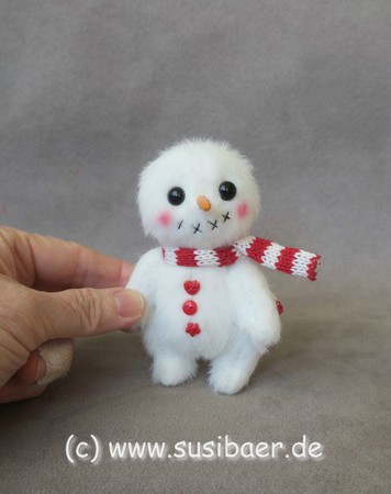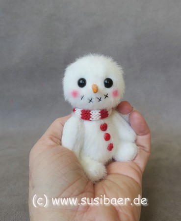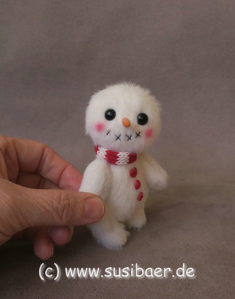ist ca. 10cm groß, hat 5 Gelenke, Glasaugen aus Lauscha, eine modellierte Nase und ist aus Longpile genäht
