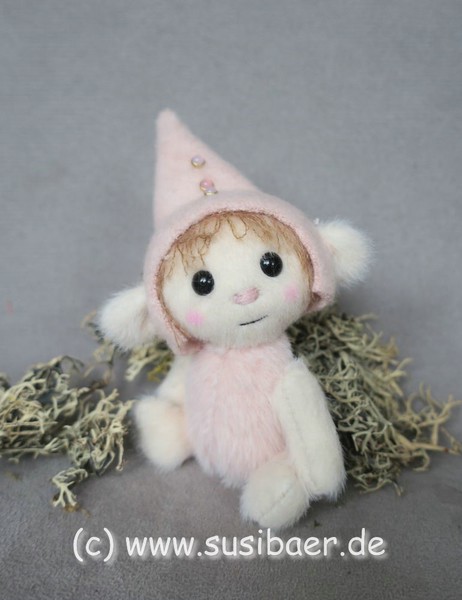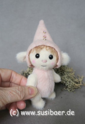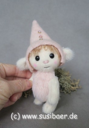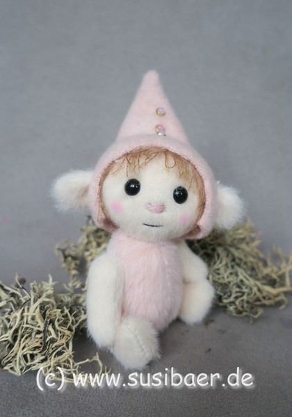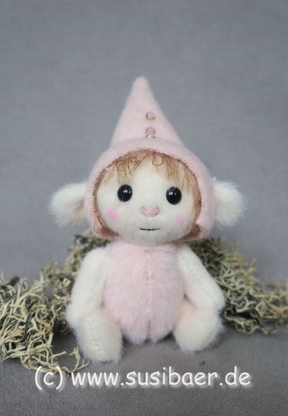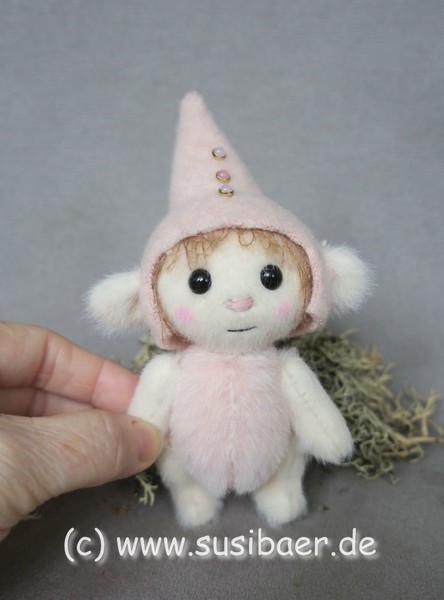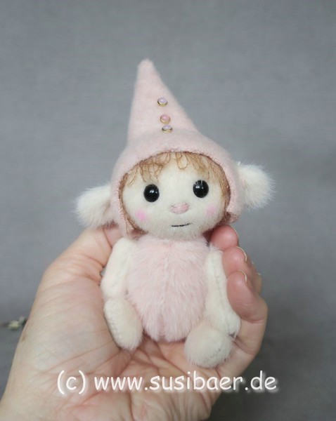 Ich habe sie aus Longpile genäht, sie hat Glasaugen aus Lauscha, ist ca. 11 cm groß (mit Mütze 11cm) und sie ist 5fach gescheibt