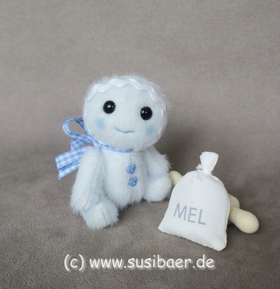 ist ausgestreckt ca. 10,5cm groß, aus Longpile genäht, voll beweglich und hat Glasaugen aus Lauscha