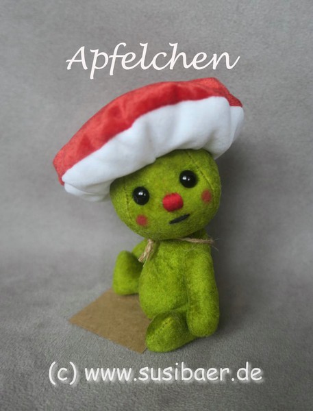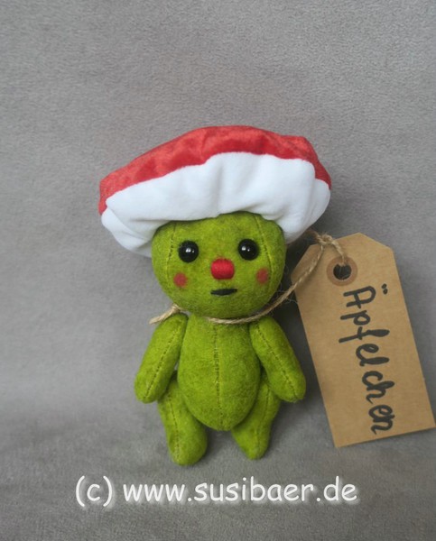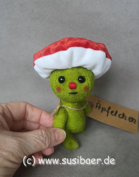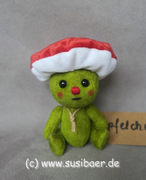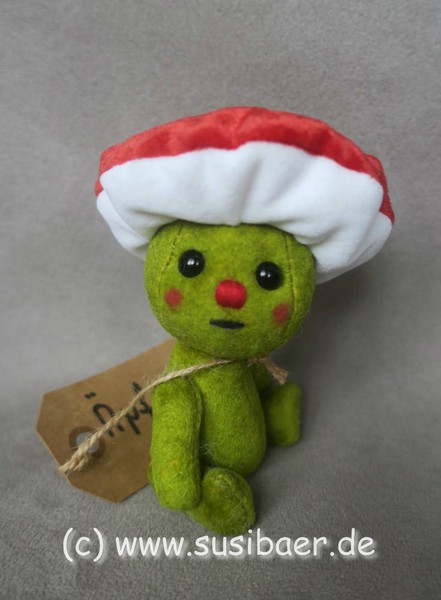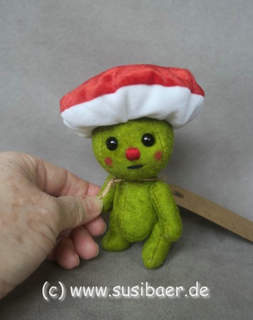 sie sind ohne Hut (er ist festgenäht) ca. 10cm groß und mit Hut ca. 12,5 - 13cm. Er hat 5 Gelenke, ist aus Long Pile und Vintage Velvet genäht und hat Glasaugen aus Lauscha