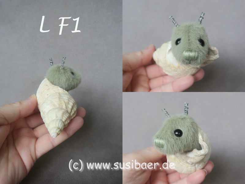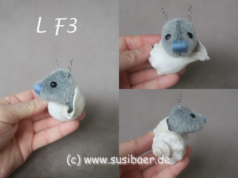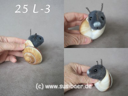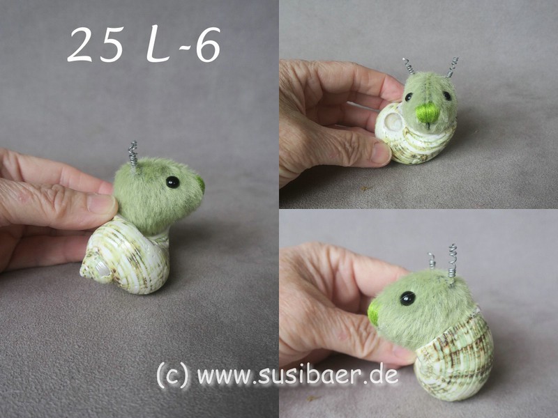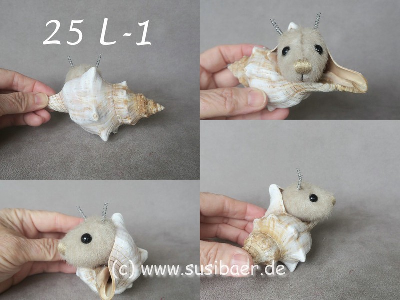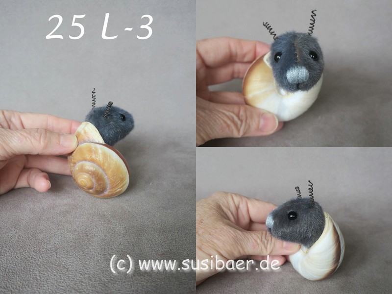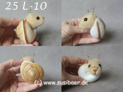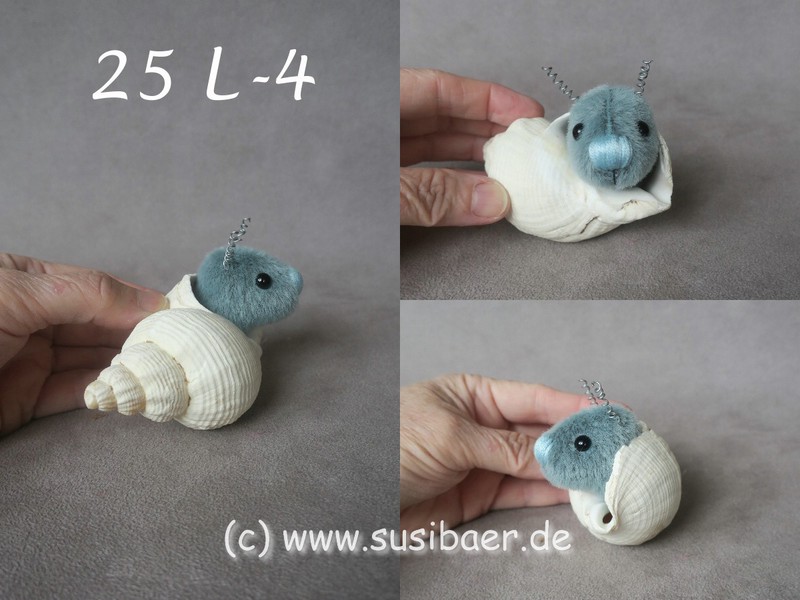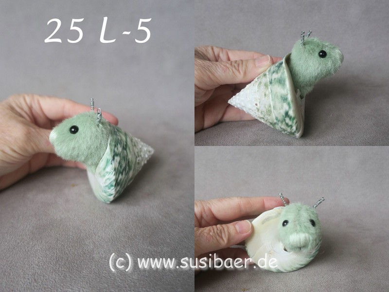 auch diese großen Schneggis sind aus verschiedenen Minibärenstoffen genäht und in echte (größere)  Schneckenhäuser geklebt.
