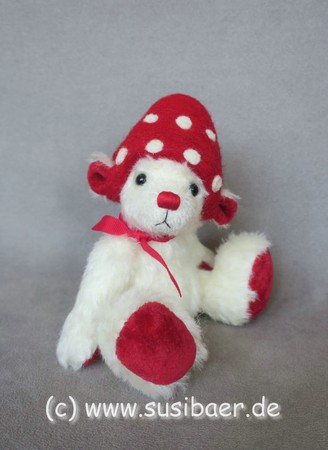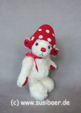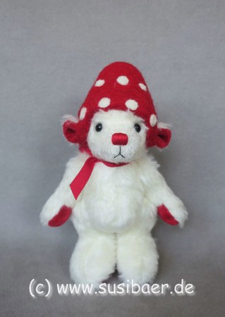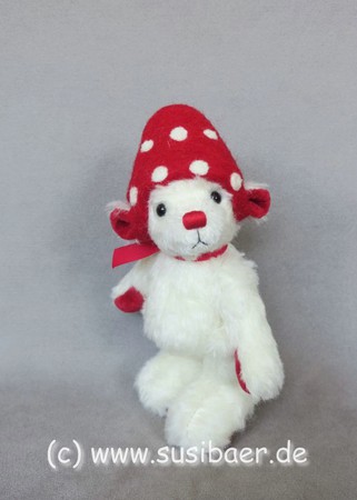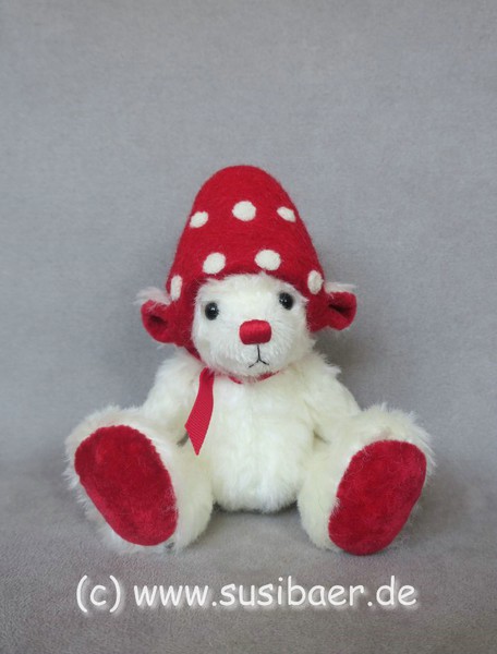 ist ca. 17cm groß, aus Schulte Mohair genäht, fünffach gescheibt, mit Glasaugen aus Lauscha und einer gestickten Nase