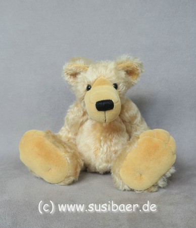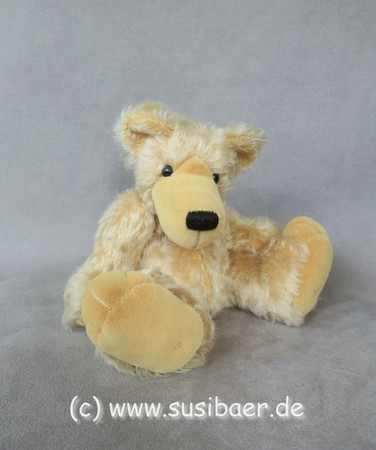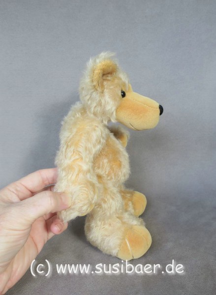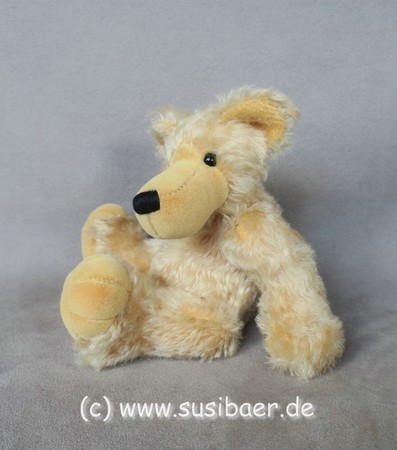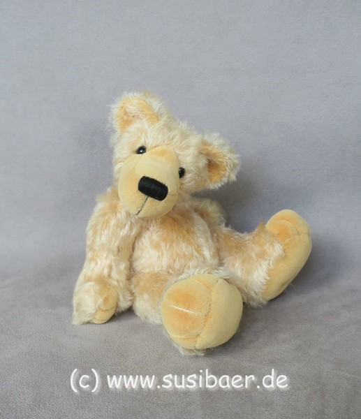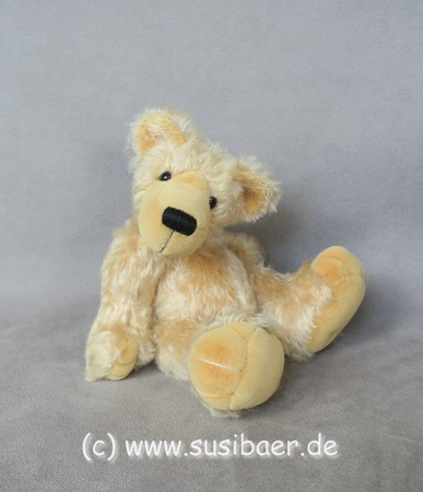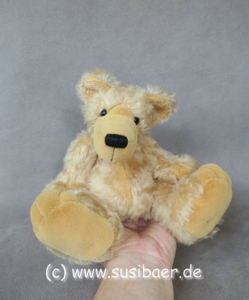 ist ein typischer Susibär- Wombel mit lockeren Gelenken und Gummigranulat in Händen und Füßen, so dass er schön kuschelig und anschmiegsam ist